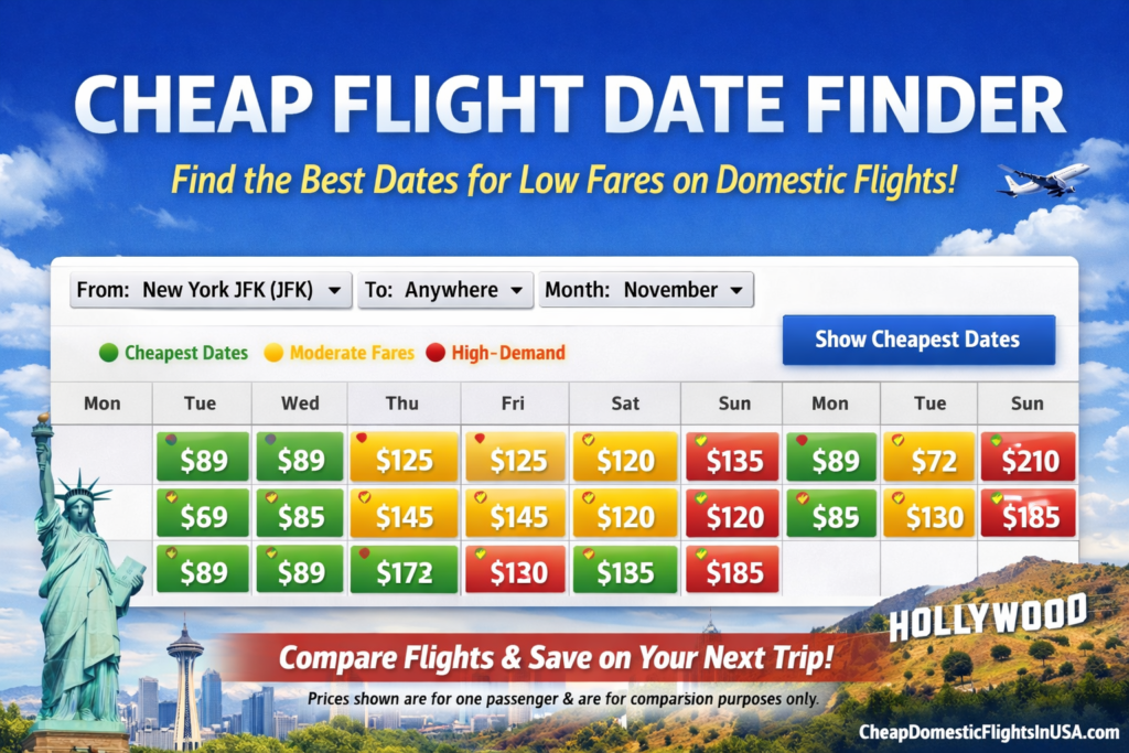 The CHEAP FLIGHT DATE FINDER lets you explore domestic flights in the USA from over 20 major airports, including JFK, LAX, ATL, and more. Easily view which dates have the lowest fares, which are moderate, and which are high-demand, all color-coded for clear planning. Prices shown are for a single passenger and are provided as indicators only.